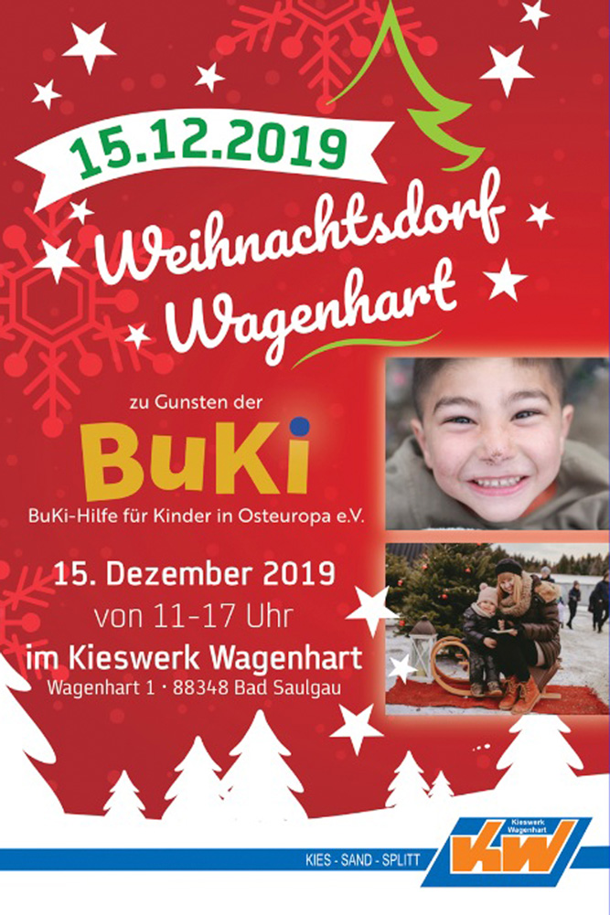 Am Sonntag, den 15.12.2019 ist es wieder so weit. Dann öffnen sich die Tore zum Vierten Weihnachtsdorf im Kieswerk Wagenhart. BuKi freut sich ganz besonders darüber, denn der Gewinn aus dem Weihnachtsdorf kommt unmittelbar den BuKi-Kindern in Cidreag zu Gute.