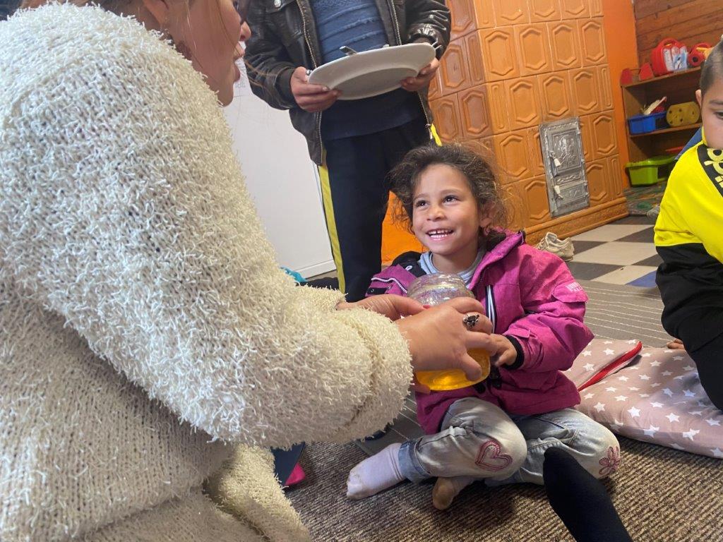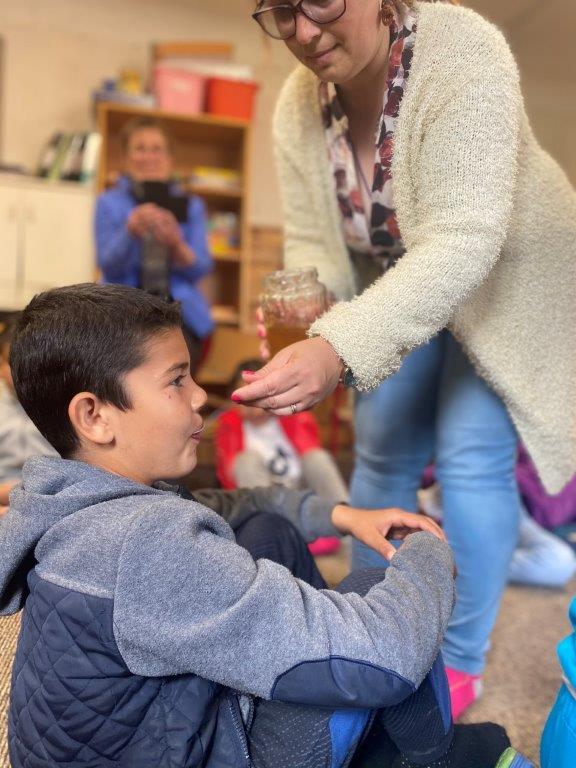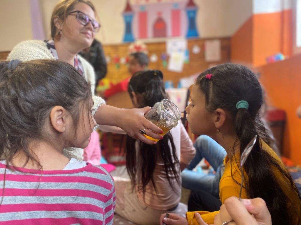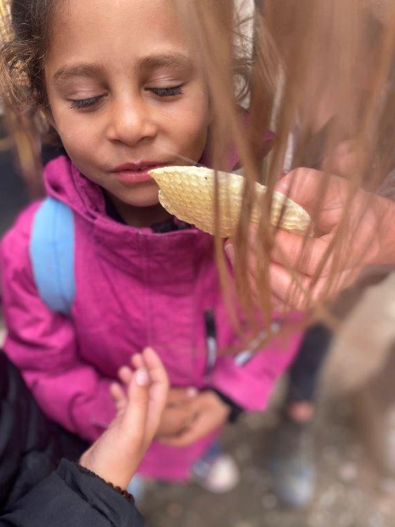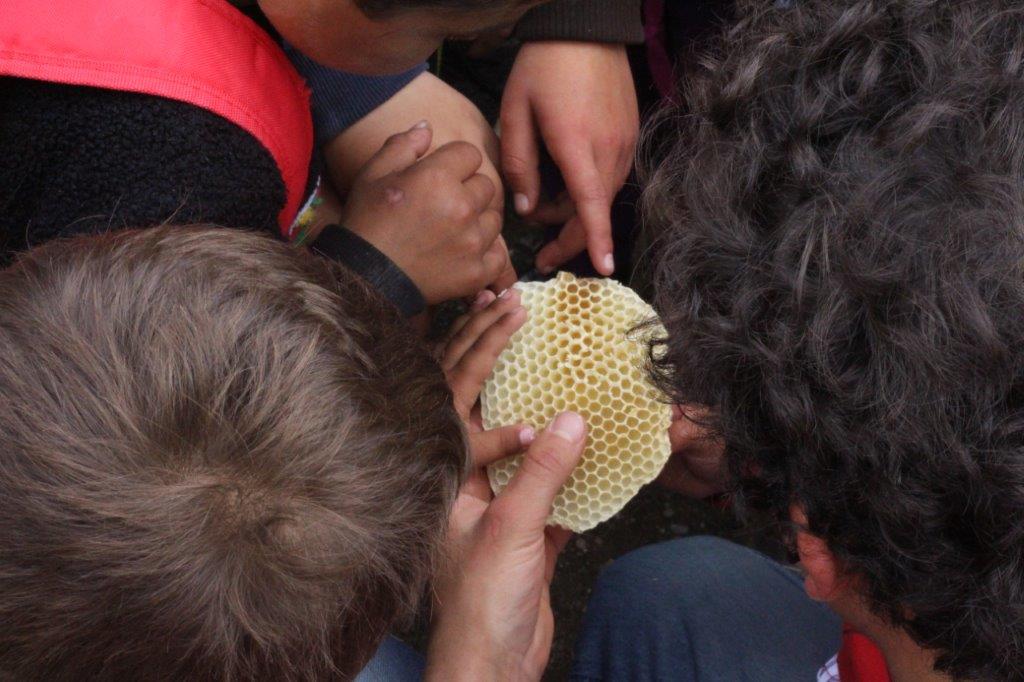Ein Ehepaar aus dem Dorf hat Bienen im Garten und stellt eigenen Honig her. Die Kinder durften dabei sein, das Zuhause der Bienen erkunden, an den Honigwaben riechen und bei der Herstellung des Honigs zuschauen.