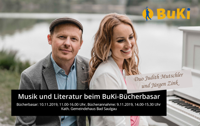 Musik inspiriert zum Lesen und Schmökern; man taucht ein in die Seiten, die vor einem liegen und wird von den Geschichten hinweggetragen. Schon längere Zeit begleitet den BuKi-Bücherbasar das Duo Judith Mutschler und Jürgen Zink. Mit ihrer sanft und erfüllenden Stimme zugleich, schafft es Judith Mutschler immer wieder aufs Neue eine entspannte Leseatmosphäre zu schaffen.