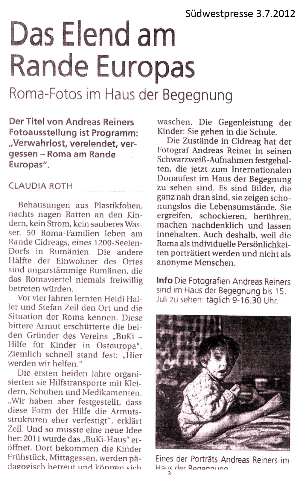 „Verwahrlost, verelendet, vergessen – Roma am Rande Europas“, so lautet der Titel der Fotoausstellung, die der Fotograf Andreas Reiners aus Bildern seines Aufenthalts in Cidreag zusammengestellt hat. Die Fotos dokumentieren die bittere Armut der Roma, die wir nicht einfach hinnehmen können und gegen die wir mit unserem BuKi-Projekt ankämpfen. Die Südwest Presse schreibt über die Fotos: