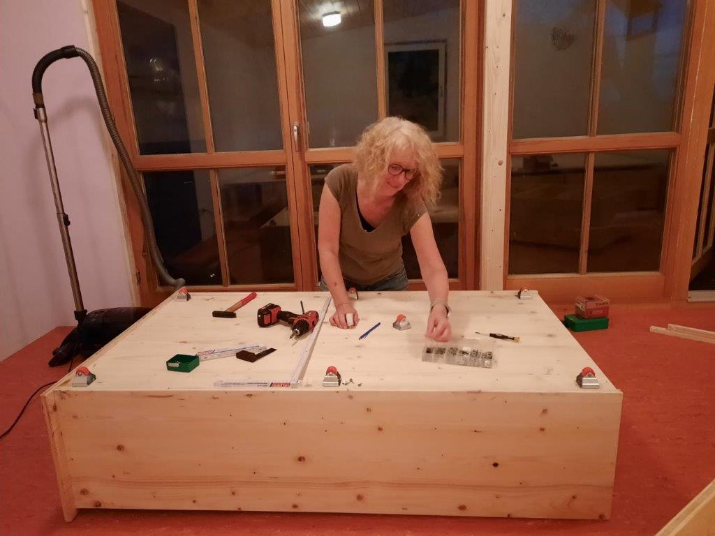 Unser Podest, als Platz zum Schlafen, Spielen, Lesen, Verstecken – maßgefertigt von Michael.