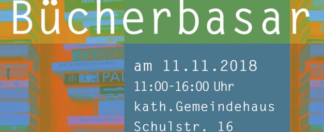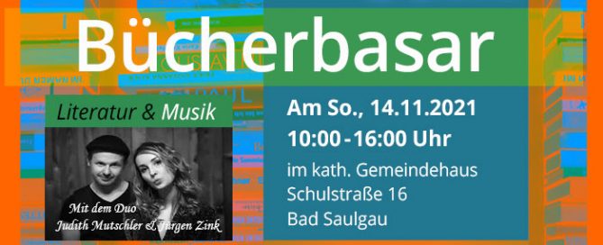 Nach über einem Jahr Corona-Pause freuen wir uns sehr, dass wir unseren BuKi Bücherbasar 2021 wieder durchführen können. Er findet am 14.11.2021, von 10:00-16:00 Uhr, im Katholischen Gemeindehaus in Bad Saulgau statt. Adresse: Schulstraße 16, 88348 Bad Saulgau. **** Bücherannahme: **** Am Samstag, den 13.11.2021 von 10:00-15:00 Uhr, könnt ihr Bücherspenden im Katholischen Gemeindehaus in Bad Saulgau abgeben. **** Bitte beachtet dabei: **** Erfahrungsgemäß lassen sich Bücher, die älter als 10 Jahre sind, kaum mehr durch BuKi verkaufen. Deshalb: Spenden sie uns möglichst aktuelle Bücher, die nicht älter als 10 Jahre alt sind. **** Gut verkaufen lassen sich: **** [...]