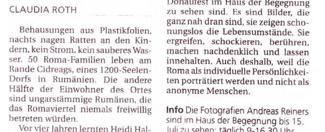 "Verwahrlost, verelendet, vergessen - Roma am Rande Europas", so lautet der Titel der Fotoausstellung, die der Fotograf Andreas Reiners aus Bildern seines Aufenthalts in Cidreag zusammengestellt hat. Die Fotos dokumentieren die bittere Armut der Roma, die wir nicht einfach hinnehmen können und gegen die wir mit unserem BuKi-Projekt ankämpfen. Die Südwest Presse schreibt über die Fotos: "Es sind Bilder, die ganz nah dran sind, sie zeigen schonungslos die Lebensumstände. Sie ergreifen, schockieren, berühren, machen nachdenklich und lassen innehalten. Auch deshalb, weil die Roma als individuelle Persönlichkeiten porträtiert werden und nicht als anonyme Menschen." Dieser Link führt zum ganzen Beitrag [...]