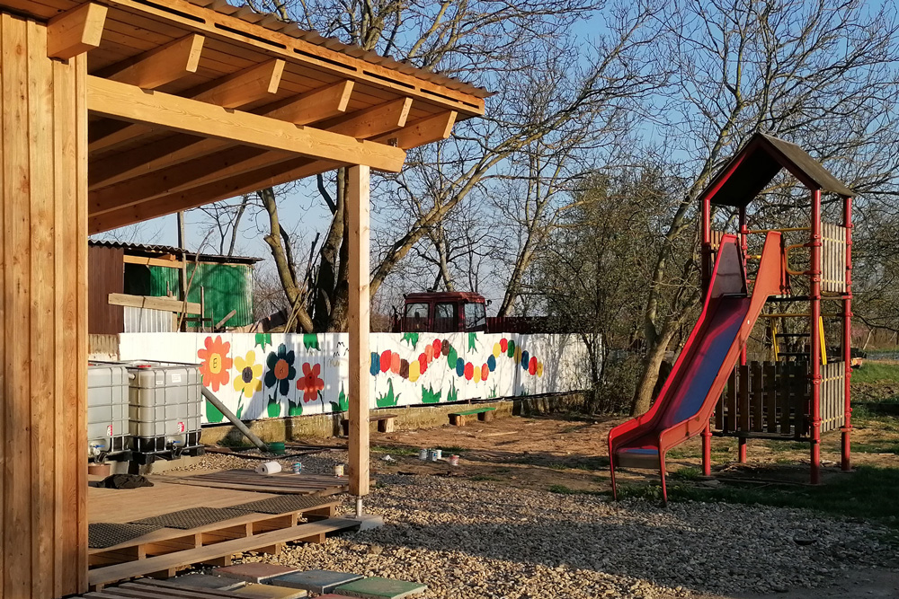 Täglich kommen unsere Kleinsten nun ins BuKi-Haus, essen und spielen auf der Veranda des neuen Holz-Häuschens. Der Zaun daneben stand bis letzte Woche noch unbemerkt daneben – ohne Farbe.