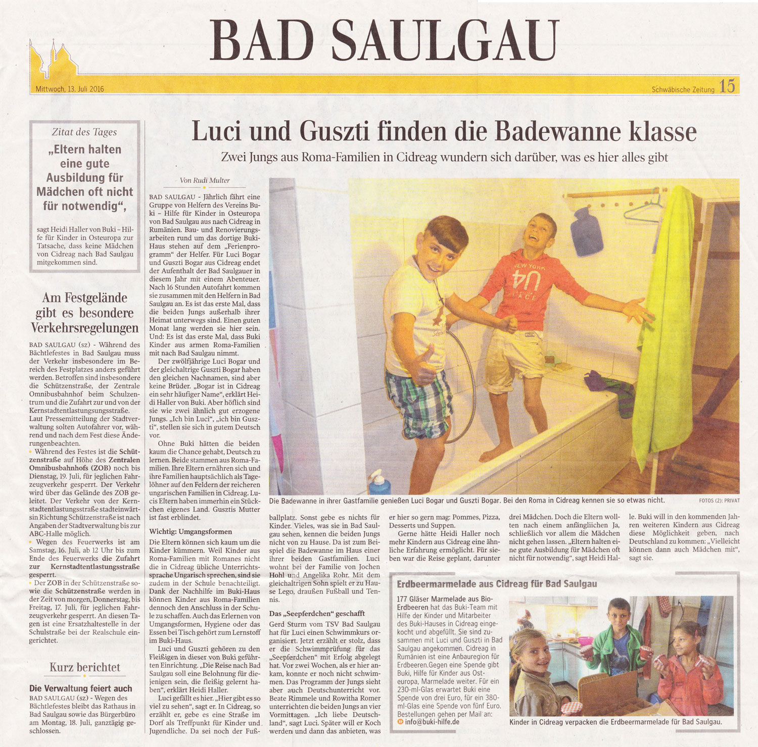 Die Schwäbische Zeitung berichtet über unsere Austausch-Aktion: Nachdem bisher immer nur Helfer aus Deutschland in Cidreag zu Besuch waren, haben wir nun einmal BuKi-Kinder zu uns nach Bad Saulgau eingeladen. Gut einen Monat haben Luci und Guszti in Gastfamilien verbracht und dabei viele neue Erfahrungen und Eindrücke gesammelt. Hier der Artikel zum Nachlesen.